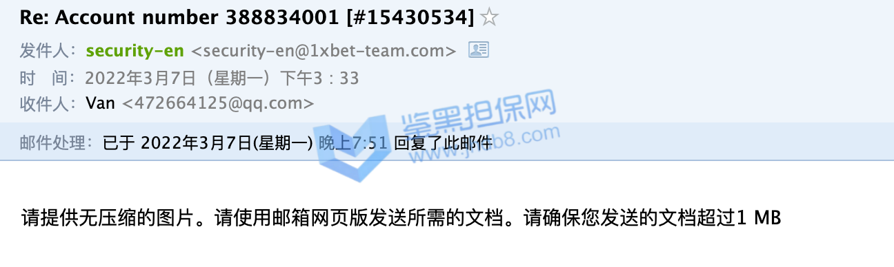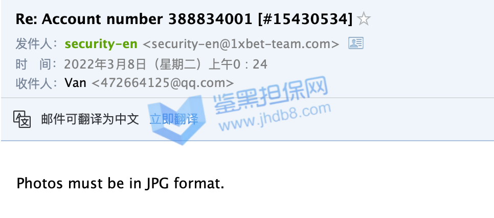 2022年3月1日我在1xbet充值了1万8的金额,想买各种比赛,到昨天3月7日,因为运气好,这个1万8的金额已经变成了6万元,我想取款,结果得到的消息是必须连续安全部分审核,我好奇为何注册的时候,存款的时候没有让我注册,但是也没多犹豫。随后就开始了一系列莫名其妙且扯皮的的过程。首先是一个说英文的客服回复我,让我提供银行流水证明,还必须是原件,带公章的,中国银行刚好可以开具这部分信息,我就提供了,然后让我提供身份证正反面,我也提供了,最奇葩的来了,让我把身份证放脸旁边拍一个自拍,带上他发我的那个邮件,这个有点过分了,但是我还是照着要求做了,随后他和我说资料审核结束,随后会有人联系我。我等了好久还是没有人联系我,我就主动发邮件询问,结果这次是个中文客服回复我,让我在不同的角度再拍一次身份证照片,我照做了,然后以文件大小不足1m为由让我重拍,我重拍之后,又换了个英文客服,说我提供的不是源文件,无法受理。我之后用不同角度/不同光线/甚至是扫描件发送我的身份证照片,都和我说不是他们要的文件,我随后发了我的护照照片,也是扫描件,一开始回复我要jpg照片文件,我发了以后,又回复我说不是他们要的文件了。这一系列过程下来让我觉得他们就是在刁难我,甚至是在骗取我的个人信息。希望鉴黑网可以帮我一下,帮我追款,谢谢。我的1xbet账号是388834001