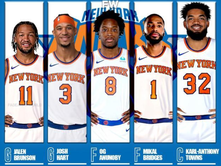 尼克斯这几年在五虎身上砸了不少钱。提前续约之后,布里奇斯的合同还剩5年1.75亿美元,布伦森还剩4年1.56亿美元,阿努诺比还剩4年1.75亿美元,唐斯还剩3年1.71亿美元,哈特还剩3年6200万美元。尼克斯五虎剩余合同的总薪资达到大约7.4亿美元。
