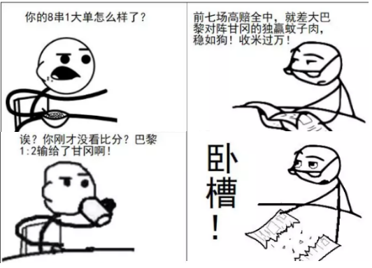 综上所述,最惨的情况就是一个人的长串只剩下了最后一场强弱分明的蚊子肉,只要红了就凑整提款,上岸而去,但在最后一分钟,强队遭遇逆袭,整个单子爆掉……