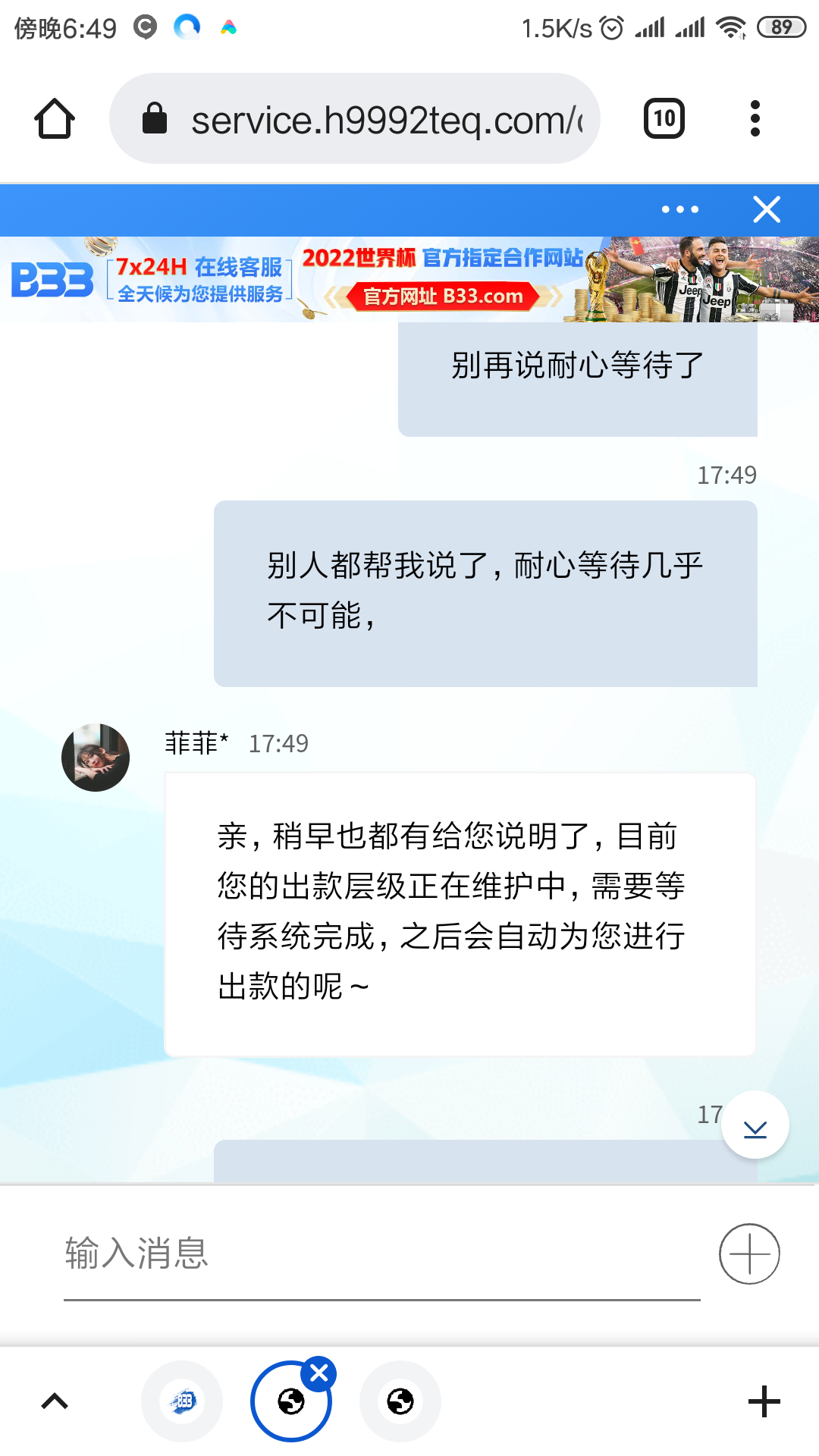 注册没几天!看一个山河直播,他推广b33很长时间,经常直播,QQ群最近没了也没有直播了,联系方式都被腾讯打没了可能!他作担保的平台,不少人也说这台子不黑的,我才开始准备好好打!我玩了首存100+38!出款了,后面500玩电子剩下80一炮出6400!这台子确实能爆!就去充值2000嗦哈真人过两关!提现8000说我倍投下注,涉嫌对打!我就很纳闷了!我在自己玩的老台子百多万啊怎么没出现过!给我10倍打码电子棋牌捕鱼,我还专门直播给玩家们,确实很爆,还打出2.4个出来!提现就出款通道维护,你这层级维护,系统维护完成就可以出款!客服无法告知你出款具体时间!我都说了我是找别人担保我想好好找个台子,跳槽过来娱乐的,我这又去自己老台子充值5000嗦哈输了又去1000输了,这都没啥,你不黑,凌晨提现到现在到账了我早都5000在平台电子了!你黑我比我输钱还要难受知道吗?审核完成都是假的,老玩家,大家都懂!希望大家自己注意,我玩了很多年了,朋友叫我来这个鉴黑网曝光,还会帮你处理!以后还是玩大台子能担保的!看上面,只要能解决这个事,搞臭他都行!