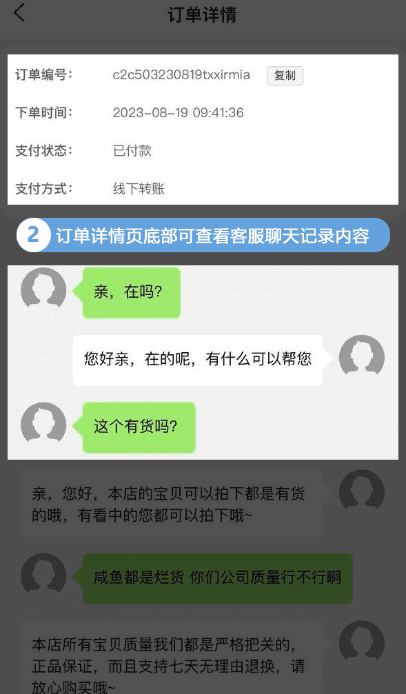 订单详情页底部可查看客服聊天记录内容