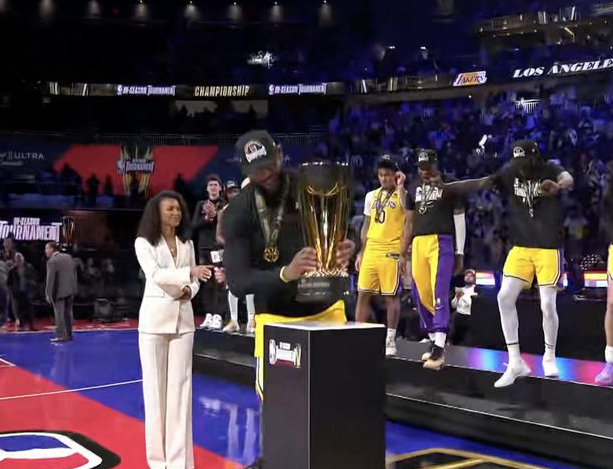 NBA首届季中锦标赛鸣金收兵,洛杉矶湖人队夺得冠军。戴维斯送出41分、20个篮板、5次助攻和4次盖帽,里夫斯得到28分,勒布朗送出两双,他们带领逐渐确立大比分优势,湖人队以123-109战胜印第安纳步行者队夺冠。赛后,詹姆斯夺得了季中锦标赛的MVP!