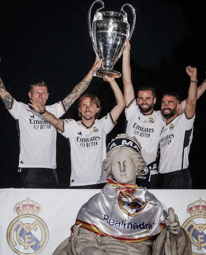克罗斯、莫德里奇、卡瓦哈尔和纳乔4名第6次夺得欧冠冠军的球员,一起举起大耳杯。