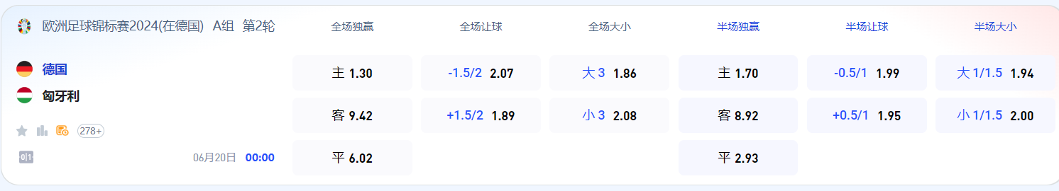 A组的一场焦点战,德国对阵匈牙利,德国在首轮比赛中以5-1大胜苏格兰,只要第二轮小组赛能够成功击败匈牙利,他们就能提前锁定出线资格!
