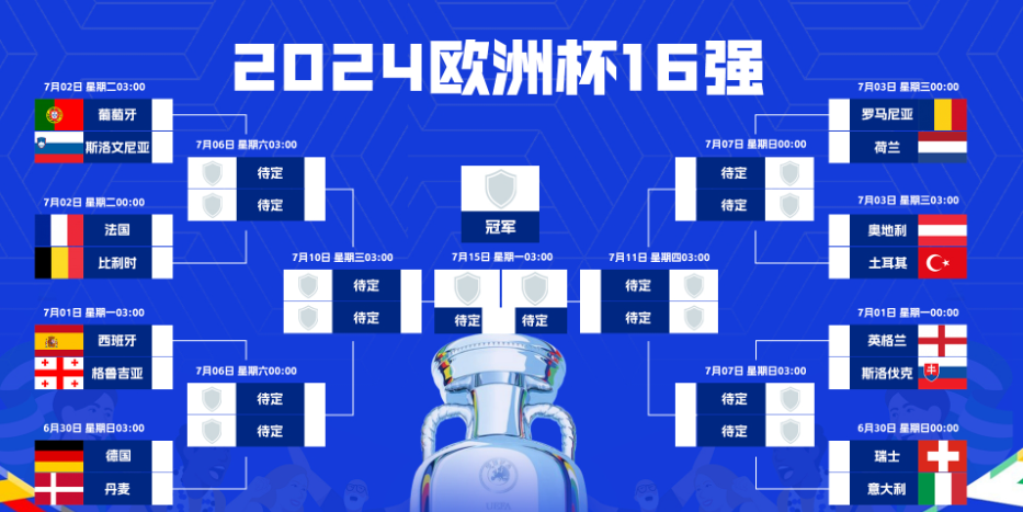 6月27日讯 欧洲杯结束全部小组赛对阵,16强球队和对阵全部确定。
